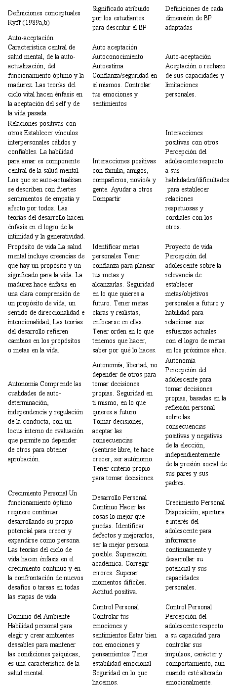 Las descripciones de los adolescentes se compararon con las definiciones conceptuales y operacionales de las seis dimensiones propuestas por Ryff (1989b). Las descripciones de los jóvenes se clasificaron en cinco de las seis dimensiones del modelo multidimensional de BP, con excepción de la dimensión de dominio del ambiente, que no fue identificada claramente por los participantes. Se revisaron nuevamente las descripciones y se identificó que varias de las aportaciones de los adolescentes hicieron alusión a la importancia del control personal para tener BP, por lo que se decidió cambiar dominio del ambiente por control personal. En la primera columna de la Figura 4, se presentan las definiciones conceptuales de Ryff, en la segunda las descripciones proporcionadas por los adolescentes y en la tercera las definiciones adaptadas para adolescentes, en la última fila se mantuvo la definición operación de Ryff respecto a domino del ambiente, pero se hizo el cambio a control personal en las descripciones de los jóvenes y en la definición adaptada a población mexicana.