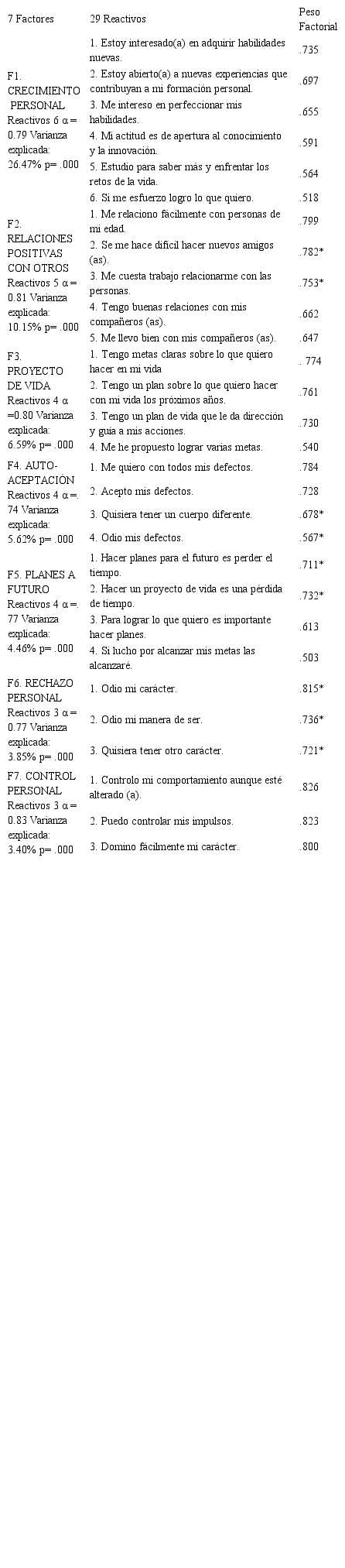 Como se mencionó anteriormente, en esta investigación sólo se identificaron cuatro dimensiones de la propuesta original de Ryff: crecimiento personal, relaciones positivas con otros, auto-aceptación y propósito de vida. Más aún, en estas dos últimas dimensiones los ítems diseñados para cada una de ellas no se agruparon en un solo factor, sino en dos factores: auto-aceptación se dividió en un factor que describe los aspectos positivos y otro factor que se denominó rechazo personal que se enfoca en los aspectos negativos. En cuanto a propósito de vida, apareció una situación semejante, se identificaron dos factores uno relacionado propiamente con el propósito de vida, con dos ítems positivos y dos negativos y el otro fue planeación a futuro, con dos ítems positivos y dos negativos. De esta manera la escala quedó conformada por 7 dimensiones y 29 reactivos.