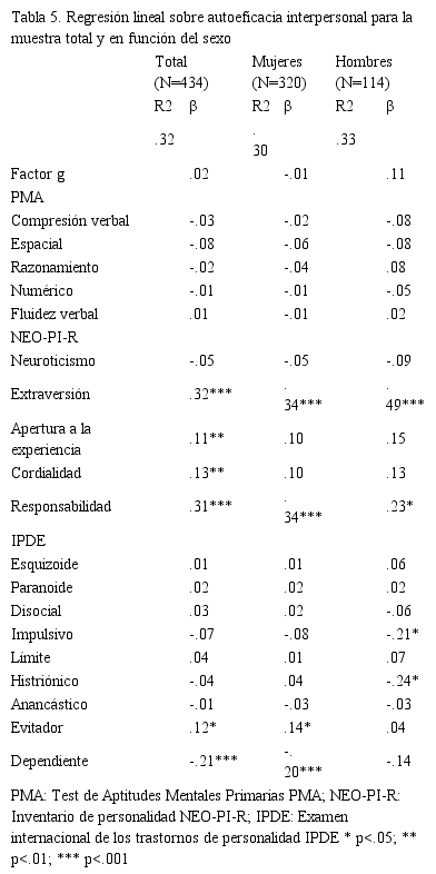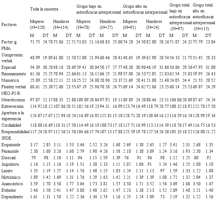 Independientemente de la autoeficacia interpersonal, mujeres y hombres no se diferenciaron en el factor g ni en los factores espacial, numérico y fluidez verbal; pero sí en los factores de comprensión verbal y razonamiento, en los que puntuaron más alto los hombres. En el área temperamental, las mujeres puntuaron más alto que los hombres en los rasgos de neuroticismo, extraversión, cordialidad y responsabilidad. En cuanto a los trastornos de personalidad solo hubo dos diferencias significativas, los hombres puntuaron más alto que las mujeres en los rasgos paranoide y disocial (véase Tabla 3).