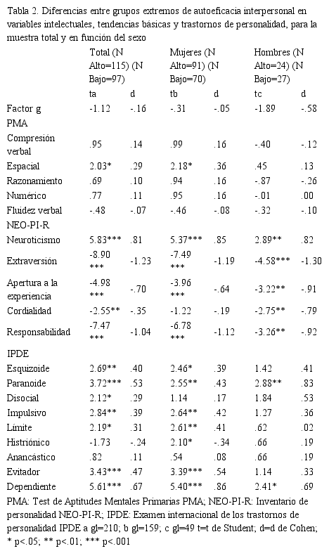 En primer lugar, independientemente del sexo, los resultados indicaron que las personas del grupo bajo en autoeficacia interpersonal frente a las del grupo alto rendían mejor en el factor espacial, se mostraban más inestables emocionalmente, eran más introvertidas, menos abiertas a la experiencia, menos cordiales, menos responsables en las tareas laboral/académicas, y puntuaban más alto en todos los trastornos de personalidad – excepto el histriónico y el anancástico (véase Tabla 2).