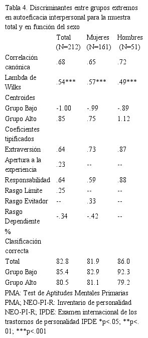 En el análisis llevado a cabo para el grupo de mujeres de alta autoeficacia interpersonal, se obtuvo que eran extravertidas, responsables y tenían menor puntuación en el rasgo de personalidad dependiente pero mayor en el evitativo que las mujeres del grupo bajo. La función clasificó correctamente al 81.9% de los casos, siendo los porcentajes similares para los grupos bajo y alto en autoeficacia interpersonal.