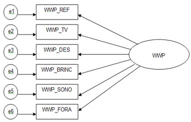 Os estudos de AFC com recurso às parcelas para a amostra total apontaram para cargas fatoriais estandardizadas com valores a oscilar entre .48 (WWP_SONO) e .86 (WWP_BRINC), sugerindo um bom ajustamento do modelo para a maioria dos indicadores considerados – χ2(9)=37.37, p<.001; χ2/df=4.15; CFI=.98; GFI=.98; RMSEA=.08 (IC 90%=.05-.11). Ao replicar as análises desdobrando a amostra (normativa/clínica), o modelo de seis parcelas para a WWP revelou mais uma vez um bom ajustamento para a amostra normativa – χ2(9)=33.43, p<.001; χ2/df=3.72; CFI=.97; GFI=.97; RMSEA=.09 (IC 90%=.06-.12); e clínica – χ2(9)=15.82, p<.001; χ2/df=1.76; CFI=.97; GFI=.97; RMSEA=.07 (IC 90%=.00-.13). As cargas fatoriais das parcelas situaram-se entre .43 (WWP_SONO) e .83 (WWP_BRINC) para a amostra normativa, e entre .19 (WWP_SONO) e .82 (WWP_BRINC) para a amostra clínica.