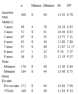 Uma vez que o objetivo neste ponto era estabelecer uma base normativa preliminar para a Escala de Atividade WWP, recorreu-se somente à amostra normativa (Quadro 2), cujas diferenças de resultados em relação à amostra clínica foram já esclarecidas no ponto anterior. A análise dos resultados em função da idade mostrou existir uma diferença estatisticamente significativa entre os grupos etários, F(6, 326)=2.76, p<.05: os resultados tenderam a decrescer com a idade até aos 6 anos, o que coincide com a entrada na escola para a maioria das crianças, estabilizando a partir daí (com um valor médio mais baixo aos 8 anos). A análise em função do nível escolar, comparando as crianças pré-escolares com as que frequentam o 1º ciclo, mostrou que as primeiras obtêm resultados significativamente mais elevados do que as segundas, t(338)=3.20, p<.01. Não se evidenciou diferença estatisticamente significativa entre as médias dos resultados em função do sexo, t(338)=-0.11, p>.05.