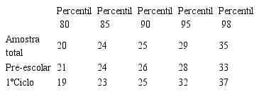 O Quadro 3 apresenta valores de percentis, destacando-se o facto de estes diferirem em função do nível escolar das crianças. Assim, os