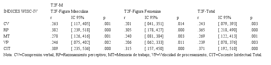 En la Tabla 1 se presentan los coeficientes de correlación de Pearson entre el T2F-M (puntuación directa) y el WISC-IV (cocientes intelectuales). Como se puede observar, todas las correlaciones entre los índices del WISC-IV y las puntuaciones en la figura masculina, femenina y total en el T2F-M fueron positivas, estadísticamente significativas y bajas. Se obtuvieron coeficientes de correlación más altos en la figura masculina que en la femenina y la puntuación total. En la mayoría de las correlaciones se obtuvieron probabilidades inferiores al uno por ciento (.01) y presentaron intervalos de confianza que fluctúan de índices positivos muy débiles a moderados. Un análisis de regresión lineal múltiple, considerando el CIT en el WISC-IV como variable criterio y como variables predictoras las puntuaciones directas en la figura masculina, femenina y en el total del T2F-M, mostró que las distintas puntuaciones en el T2F-M son un predictor significativo del CIT en el WISC-IV, con un tamaño del efecto moderado, que explican el 15% de la varianza en este test, R2=.152, F (3,147)=8.782, p=.000, f 2 =.17, IC 95% [.04, .32].