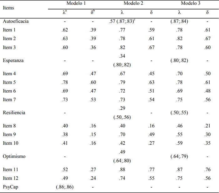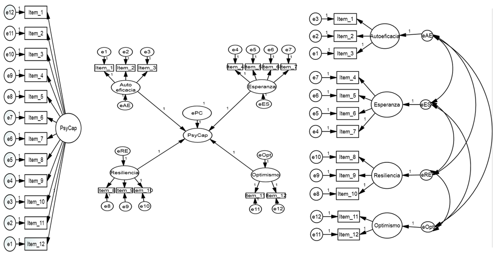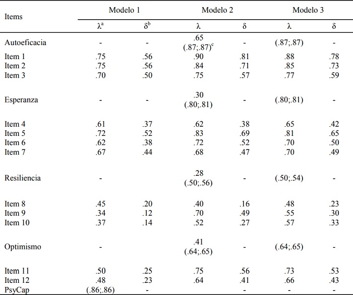 Tres modelos de ajuste fueron sometidos a análisis, un modelo de primer orden (Modelo 1), un modelo de segundo orden (Modelo 2) compuesto por cuatro factores (autoeficacia, esperanza, resiliencia, y optimismo) con un factor de segundo orden llamado Capital Psicológico, y un tercer modelo compuesto por cuatro factores correlacionados (Modelo 3).