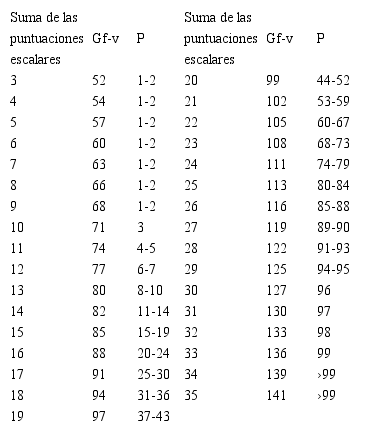 Para la construcción del Gf-nv se trabajó con los casos en que la diferencia de M y Co fuera menor a 5 puntos (1.5 DE = 3+1.5 =4.5 ≈ 5). Se eliminaron 213 casos y se conservó el resto (n=1224). Luego se sumaron las puntuaciones escalares de los dos subtests principales y su resultado se convirtió a puntuaciones z. Estas fueron transformadas en puntuaciones compuestas con una M=100 y DE=15 (z * 15+100). Para la construcción del Gf-v se analizaron los casos en que la diferencia de S y Ad es menor a 5 puntos, con lo cual se eliminaron 138 casos y se conservó el resto (n=1299). Al igual que en el índice anterior, se sumaron las puntuaciones escalares del subtest principal S y el subtest optativo Ad. Luego, se convirtieron a puntuaciones z, las cuales fueron transformadas en puntuaciones compuestas con una M=100 y DE=15 (z * 15+100).