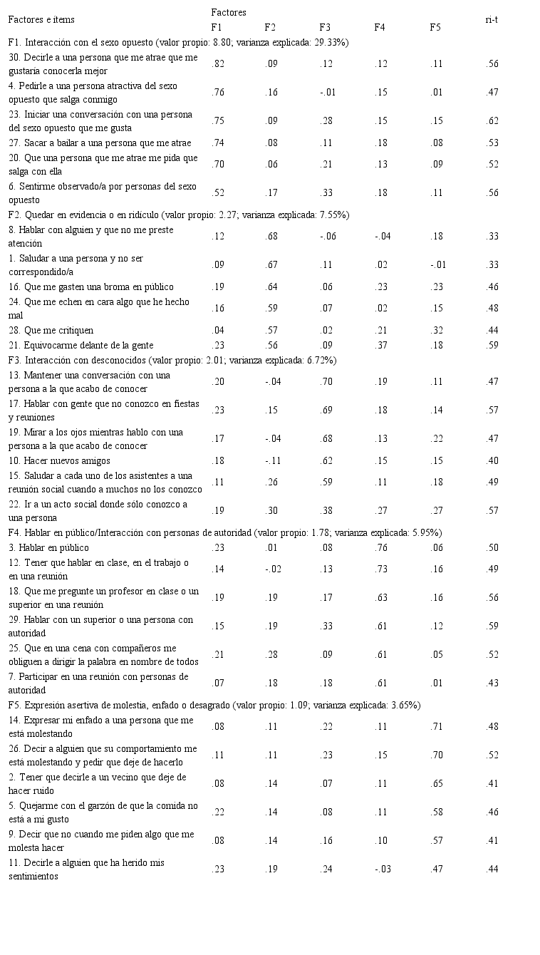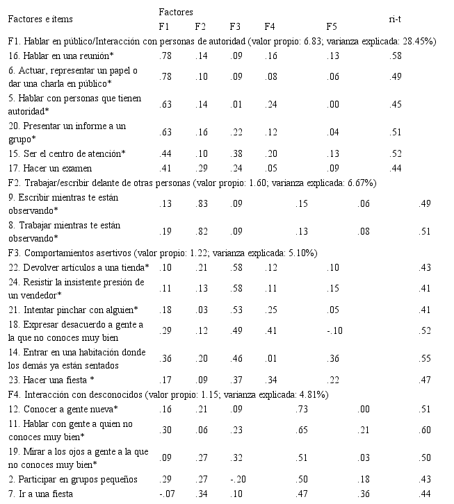 Por su parte, el AFE mostró, igualmente, una solución de cinco factores que explicaban el 53.20% de la varianza acumulada. Los factores obtenidos fueron: F1. Interacción con el sexo opuesto, F2. Quedar en evidencia o en ridículo, F3. Interacción con desconocidos, F4. Hablar en público/Interacción con personas de autoridad y F5. Expresión asertiva de molestia, desagrado o enfado. En la Tabla 1 se incluyen las saturaciones de los ítems en cada factor y las correlaciones ítem-total de los mismos. Todos los ítems saturaban por encima de .40 en sus factores correspondientes, excepto el ítem 22.