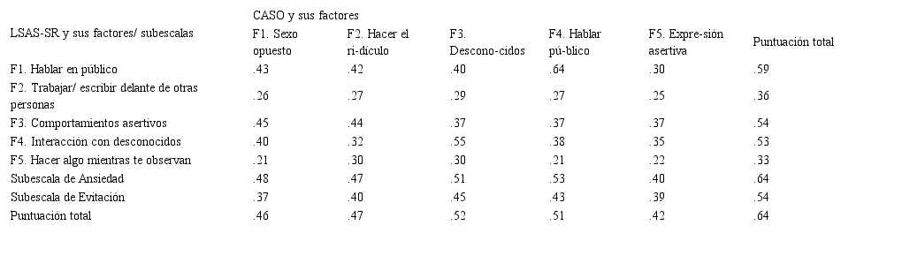 La correlación de Pearson entre las puntuaciones totales del CASO y la LSAS-SR fue de .64, al igual que la de la puntuación total del