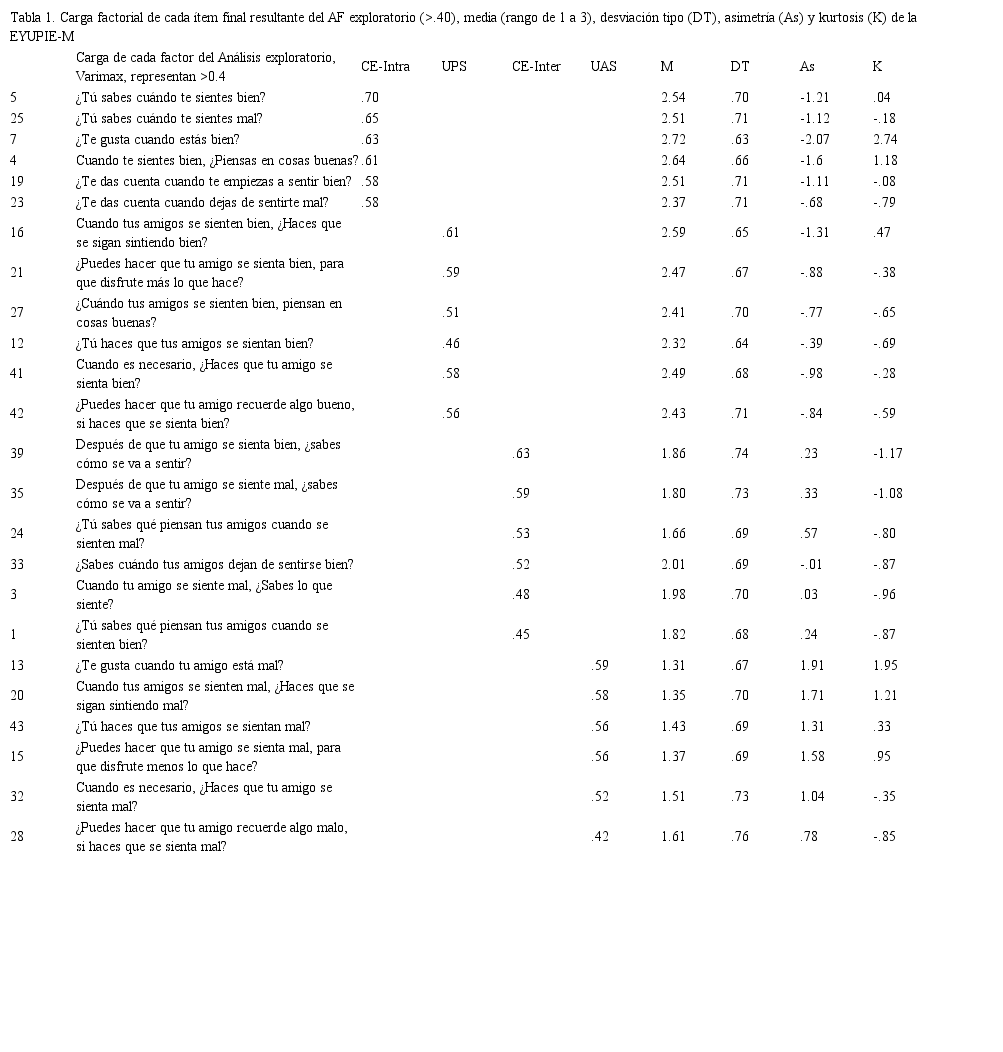 La escala final se compuso de 24 ítems, seis por cada sub-escala, y se denominó EYUPIE-M (Escala Yucatán del Uso Percibido de la Inteligencia Emocional en Menores).