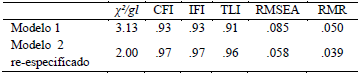 Según los resultados obtenidos en este segundo análisis, no se establecieron nuevas interacciones entre ninguna otra pareja de errores, ya que se identificó que el modelo de medida reespecificado presentó un buen nivel de ajuste a los datos observados (ver Tabla 2).