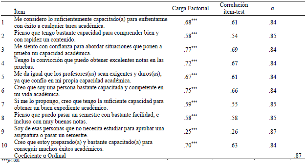En relación al modelo hipotético unifactorial original los resultados no fueron satisfactorios para apoyar su ajuste a los datos observados, por lo que se decidió realizar una búsqueda de especificaciones estableciendo dos interacciones de errores estandarizados, probablemente esto ocurre debido a la existencia de sesgo en las respuestas de la escala, sobre todo si existe niveles de error en la comprensión de ciertos ítems que presentan un doble propósito (“pienso que puedo pasar de un semestre con bastante facilidad, e incluso con muy buenas notas”) o bien están formulados de manera negativa (“soy de esas personas que no necesita estudiar para aprobar una asignatura o pasar un semestre”), lo que sugiere que en futuras investigaciones estos ítems deben ser revisados. El modelo de medida final, considerando las dos interacciones de errores estandarizados, presentó un buen nivel de ajuste a los datos observados.