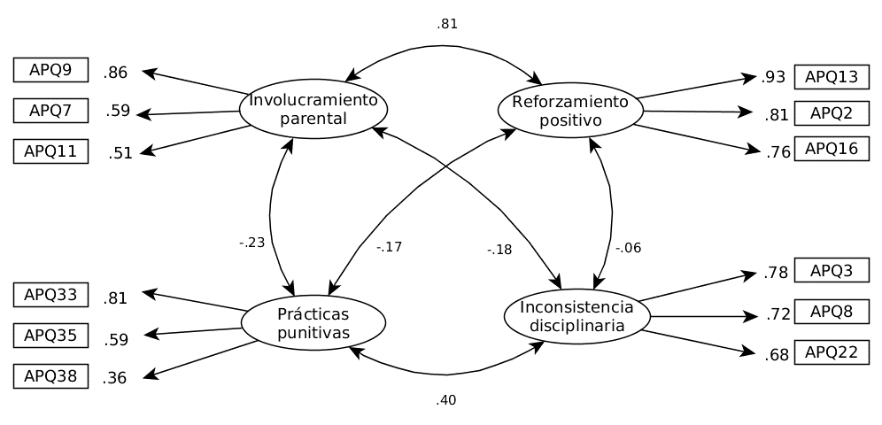 El modelo de 4 factores de prácticas parentales mostró un ajuste satisfactorio. Los resultados son análogos a los de Scott et al. (2011) y validan la distinción entre las cuatro dimensiones de prácticas parentales consideradas, dos positivas (reforzamiento positivo e involucramiento parental) y dos negativas (inconsistencia disciplinaria y prácticas punitivas). Los factores de prácticas positivas y negativas se relacionan entre sí en la forma esperada. La relación entre reforzamiento e involucramiento es fuerte, lo que explica que en algunos estudios hayan sido tratados como un solo factor (Molinuevo, Pardo, & Torrubia, 2011).
