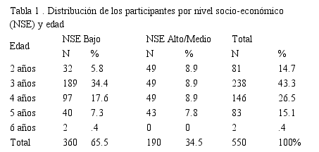 Para el estudio se fusionaron dos muestras con las que se ha trabajado en investigaciones previas, obteniéndose un total de 550 participantes, 284 niños (52%) y 266 (48%) niñas. El rango de edad de los participantes fue de 2 a 6 años recién cumplidos (M=3.4, DS=.93).