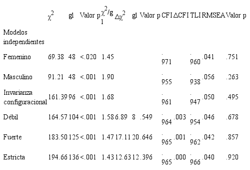 Al realizar el análisis de cada sexo por separado, el modelo ajusta muy bien en las mujeres, con todos los indicadores dentro de lo esperado; en el caso de los hombres, el TLI=.938 es ligeramente bajo, y el RMSEA=.056 p=.263 ligeramente alto, pero no significativo. Al analizar los índices de modificación, no se encontró ninguno que fuese mayor a 20, y que fuese factible de implementar sin alterar el modelo teórico, por lo que se decidió continuar con el análisis de invarianza sin realizar búsqueda de especificación. En la Tabla 2 se puede observar que se presenta invarianza métrica estricta por sexo, tanto al analizar las diferencias en Chi-Cuadrado entre los distintos modelos sucesivos de invarianza, así como las diferencias en CFI, que siempre son inferiores a .01.