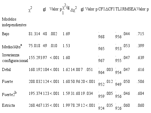 Al realizar el análisis por separado de los niveles socioeconómico NSE medio/alto con NSE bajo (Tabla 3), el modelo del nivel bajo se ajustó bien a los datos; el nivel medio/alto no pudo ser estimado, por dificultades para estimar la varianza del factor prácticas punitivas. La carga factorial en este nivel socioeconómico entre la conducta “pegar con una correa” (ítem 38) y el factor de prácticas punitivas era casi 0, lo que se puede deber a que la gran mayoría de los casos no realiza esta conducta. Al fijar el coeficiente de ese ítem a 0, se logró estimar un modelo con buen ajuste.