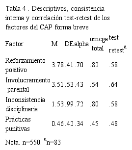 En la Tabla 4 se informan los valores descriptivos de los puntajes de cada factor, su consistencia interna y la confiabilidad test-retest, la que osciló entre .48 (prácticas punitivas) y .64 (involucramiento parental).