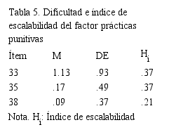 Se realizó un análisis de Mokken (Mokken, 1971) del factor de prácticas punitivas, un tipo de análisis no paramétrico de la teoría de respuesta al ítem. Se utilizó este análisis para confirmar que la suma total en la escala respondiese a un nivel de medición ordinal, pese a las dificultades que mostró su análisis de consistencia interna realizado desde la teoría clásica de medición.