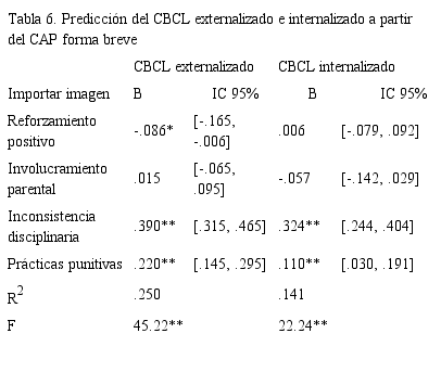 Para establecer las relaciones entre los factores y conductas desadaptativas externalizadas e internalizadas en los niños y niñas se realizaron regresiones múltiples. Respecto de comportamientos externalizados informados por la figura parental, reforzamiento positivo, inconsistencia disciplinaria y prácticas punitivas mostraron ser predictores significativos (Tabla 6). Respecto de comportamientos internalizados informados por la figura parental, solo los dos últimos fueron predictores significativos (Tabla 6). Al analizar las diferencias en R2 entre la predicción de comportamientos internalizados y externalizados, se puede observar una diferencia de .109, indicando un mayor poder predictivo sobre externalización. Al utilizar 5000 muestras bootstrap y calcular la diferencia entre ambos coeficientes de determinación, se puede observar que el intervalo de confianza al 95% IC=[.047, .166] no incluye el 0, por lo que se puede concluir que esta diferencia es estadísticamente significativa.