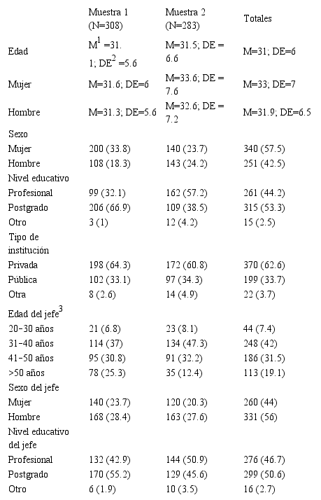 La escala se aplicó a dos grupos de personas con un intervalo de tiempo de seis meses (grupo 1, N=308; grupo 2, N=283). Los participantes tenían al menos dos años de experiencia laboral, se encontraban trabajando al momento de llenar la encuesta y reportaban a un jefe directo desde hace al menos seis meses.