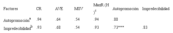 Un hallazgo importante reportado por Popa et al. (2013) es que los ítems de la escala de Narcisismo y Autopromoción se condensaron en un solo factor. En el presente estudio al efectuar el análisis exploratorio se encontró que al igual que lo reportado por Popa et al. (2013) los factores de Narcisismo y Autopromoción también se integraron en uno solo, de modo que quedaron tres factores: Autopromoción, Impredecibilidad y Liderazgo autoritario. Sin embargo, como se aprecia en la Tabla 2, al realizar el análisis confirmatorio se optó por la solución de dos factores que presentó los mejores índices de ajuste. Los valores Alfa resultantes fueron: Autopromoción (α=.94) e Impredecibilidad (α=.93).