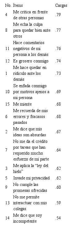 Al examinar los tres primeros ítems que tienen las cargas factoriales más altas (Tabla 4), se observa que tienen en común la descripción de acciones hostiles que el supervisor le hace al colaborador en frente de otras personas (me critica en frente de otros; me echa la culpa para quedar bien y hace comentarios negativos de mi persona a los demás). Es decir, el escarnio público de los colaboradores es lo que esencialmente define al jefe abusivo.