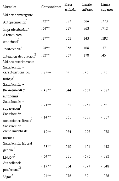 En la primera muestra (N=308) la Escala de SA se correlacionó con las siguientes escalas: Autopromoción, Impredecibilidad, Satisfacción con las características del trabajo, Satisfacción con la participación y autonomía, Satisfacción con la supervisión, Satisfacción con las condiciones físicas, Satisfacción con el cumplimiento de normas, Satisfacción laboral general y Calidad de la relación jefe – colaborador (LMX).