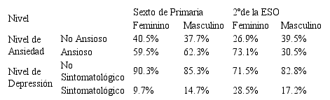 Con respecto al primer objetivo y dando respuesta al mismo, se realizó un análisis de contingencia (Tabla 1), en el que se comprueba que, en cuanto a los estados de ansiedad, los niños muestran ser más ansiosos que las niñas en sexto de Primaria (62%), situación contraria a la de segundo de la ESO donde el 73.1% de las niñas son más ansiosas que los niños. Por otro lado, el 14.7% de los niños presentan mayor sintomatología depresiva en sexto de Primaria que las niñas (9.7%), sin embargo, en segundo de la ESO las niñas son más sintomatológicas que los niños con un 28.5.
