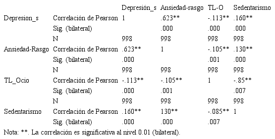 Una vez halladas las diferencias entre las medias de las variables se procedió a realizar la correlación de Pearson. En la Tabla 3 se pueden apreciar las correlaciones entre las dimensiones de Actividad física y las puntuaciones del cuestionario de autoevaluación de Ansiedad-Rasgo (STAIC-R) y el inventario de Depresión infantil de Kovacs (CDI-S). Todas las correlaciones entre las dimensiones dadas presentaron diferencias estadísticamente significativas (p<.01). Los valores más elevados se observaron en la correlación de forma positiva entre el STAI-R y el CDI-S (r=.623, N=998, p<.000).