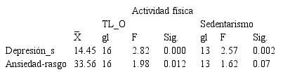 Sin embargo, al dividir la variable independiente, tiempo libre-ocio y sedentarismo, no se encontró diferencia estadísticamente significativa en relación al sedentarismo*depresión*nivel de estudio*sexo (Hume et al., 2011; Jacka et al, 2011; Stanton & Reaburn, 2014) plantean que aquellos adolescentes que no realizan actividad física por lo menos tres veces a la semana y tienen una tendencia al sedentarismo presentan altos niveles de sintomatología de depresión y ansiedad. Así pues, el estudio realizado por Olmedilla, Ortega, y Candel (2010) muestra en sus resultados que aquellas estudiantes que realizan algún tipo de actividad física frecuentemente presentan menores niveles de ansiedad y depresión en comparación con las estudiantes sedentarias, indicando una diferencia estadísticamente significativa. En esta misma línea se manifiesta Zafra Olmedilla y Toro Ortega (2009) cuando refleja en los resultados de su investigación llevada a cabo con una población de adolescentes femeninas, que no existen diferencias significativas al analizar la relación entre ansiedad por edad y por inactividad física , pero aquellas adolescentes que practicaban algún tipo de actividad física obtuvieron menores niveles de ansiedad.
