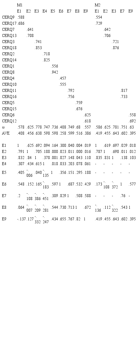 Respecto a las evidencias de validez interna convergente, en M1 la AVE de autoculparse, rumiación, poner en perspectiva, y focalización positiva, y de M2, autoculparse, rumiación y focalización positiva, son menores que .50.
