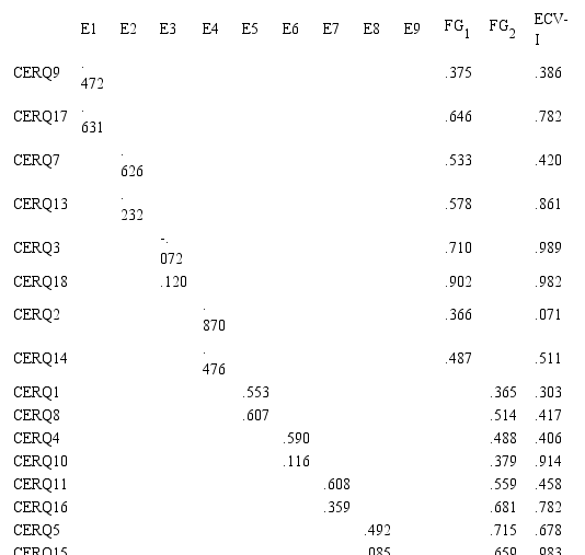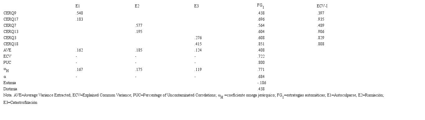 Nota. AVE=Average Variance Extracted. ECV=Explained Common Variance; PUC=Percentage of Uncontaminated Correlations; ωH=coeficiente omega jerárquico; FG1 = estrategias inapropiadas; FG2 = estrategias apropiadas; E1= Autoculparse, E2=Rumiación; E3=Catastrofización; E4=Culpar a otros; E5=Aceptación; E6=Poner en perspectiva; E=Reinterpretación Positiva; E8=Focalización en los planes; E9=Focalización positiva.