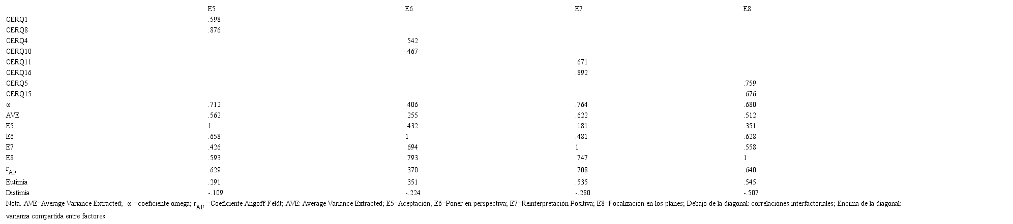 En general, los valores de confiabilidad de constructo se encuentran en el rango de lo aceptable, excepto para la estrategia de poner en perspectiva (. < .70) (Tablas 4 y 5).