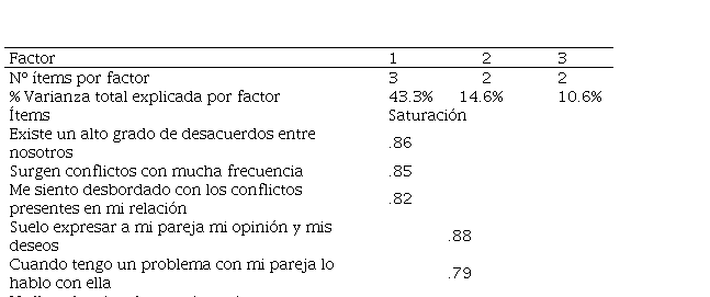 Los factores resultantes se denominaron "Frecuencia del conflicto”, “Respuesta positiva al conflicto” y “Respuesta negativa al conflicto”. De forma generalizada, se ha considerado que sería conveniente incluir al menos tres ítems por factor, pero esta práctica puede ser contraproducente al poder condicionar la estabilidad de los resultados (Velicer & Fava, 1998), lo que ha llevado a diversos autores (McDonald, 1999; Raubenheimer, 2004) a sugerir la incorporación de un mínimo de dos ítem por factor, especialmente cuando los factores correlacionan entre ellos o la escala cuenta con más de un factor. En la Tabla 1 se muestra la varianza que explica, el número de ítems que incluye y la saturación en los factores para cada elemento.