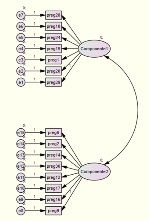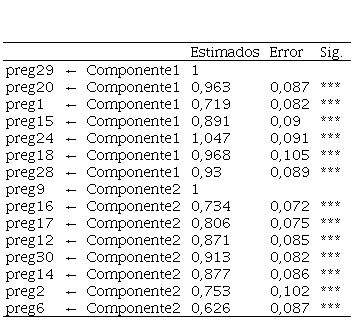 Para una comprobación de la validez del instrumento se elaboró un modelo de ecuaciones estructurales, como forma de análisis factorial. En la Figura 1 se muestra el modelo planteado, donde se pueden observar las relaciones entre variables latentes formadas por las preguntas agrupadas en componentes principales o dimensiones. Los valores de ajuste presentados se consideraron aceptables (Marôco, 2010).