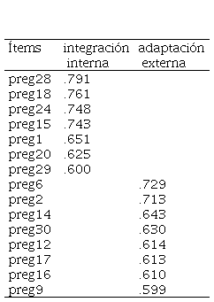 Podemos observar que las preguntas se encuentran distribuidas en dos dimensiones: integración interna y adaptación externa, en correspondencia con el marco teórico propuesto. Las relaciones entre las variables se encuentran en la Tabla 3. De acuerdo con los valores de significancia todas las relaciones presentadas fueron estadísticamente significativas (.<.05). Estos resultados permitieron validar el modelo final y el instrumento en general.