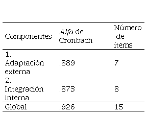 La versión del cuestionario Cultura del Aprendizaje Organizacional (OLC) para Ecuador se desarrolló a partir de la primera versión del cuestionario OLC, elaborado en Portugal, y estuvo compuesta por 30 ítems. Este cuestionario, posteriormente, se redujo a 15 preguntas, utilizando para ello el análisis de componentes principales, evaluando dos factores: integración interna y adaptación externa (Rebelo, 2006). La integración interna es aquella que hace referencia a la estructuración de los procesos internos de la empresa y la adaptación externa es la orientación de la empresa hacia el exterior (Rebelo & Gomes, 2011). La distribución en dos componentes y 15 preguntas se corresponde con un 58% de varianza explicada. Se eliminaron ítems con valores de saturación inferiores a .40 y con diferencias de saturación inferiores a .10 en más de un factor.
