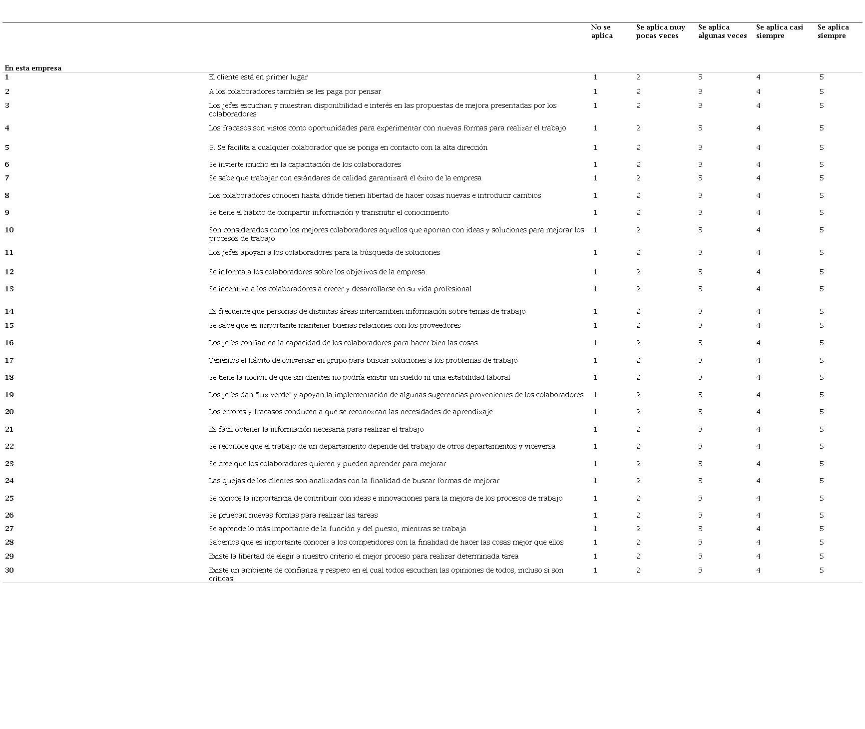 - El ítem 2 que hacía referencia “A las personas también se les debe pagar para pensar” fue modificado del original debido a que resultó difícil para los encuestados entender sobre lo que se quería conocer en ese ítem. El mismo quedó como “A los colaboradores también se les paga por pensar”.