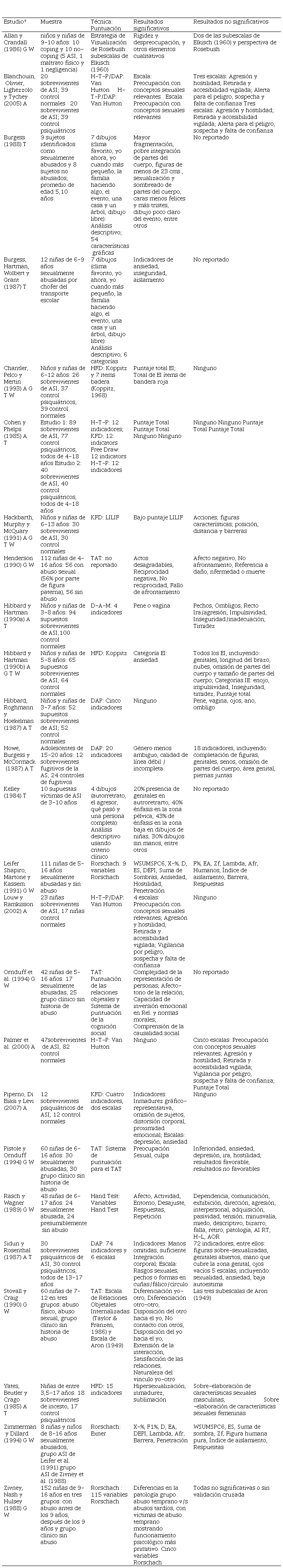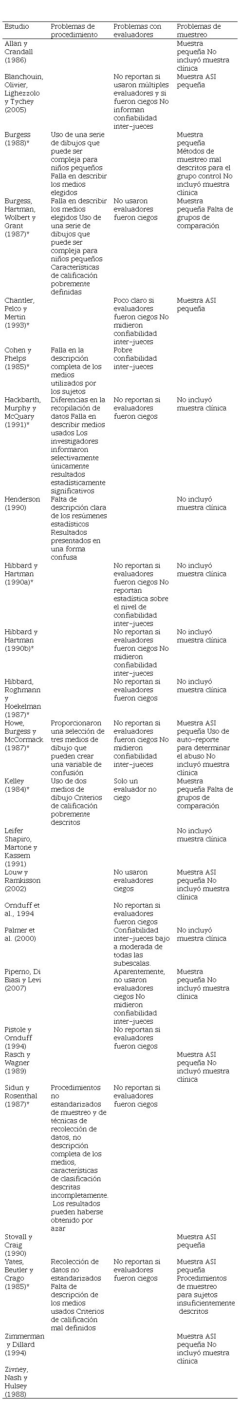 Por último, las RS y MA reportan insuficiencias en el muestreo utilizado por gran parte de los estudios primarios. Estas falencias se refieren al trabajo con muestras muy pequeñas (13 de los 25 estudios primarios, un 52%, trabajaron con muestras de víctimas de ASI de N menor a 30), falta de información acerca de cómo se llevó a cabo el proceso de muestreo, o bien errores como el uso del autorreporte para establecer la existencia de abuso. Sin embargo, una deficiencia de muestreo mayor es la falta de inclusión de grupos de control clínicos. Al respecto, solo un 36% de los estudios analizados por las RS y MA (nueve estudios) compararon los resultados del grupo de NNA con abuso con una muestra clínica de NNA sin antecedentes de abuso y dos estudios no incluyeron muestra control. Esta falencia en la conformación de las muestras no permiten aclarar si los indicadores o sistemas de puntajes que se han estudiado son característicos de ASI o si pueden también encontrarse en otro tipo de trastornos psicológicos. En otras palabras, la especificidad de los indicadores proyectivos no ha sido claramente establecida, en la medida en que no se ha probado si éstos dan cuenta de una posible experiencia (abuso) o si más bien reflejan el proceso psicopatológico (síntoma), no diferenciándose éste último de otras posibles causas.