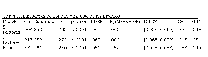 Posteriormente, con la muestra total, se realizaron tres modelos confirmatorios, considerando en primer lugar, el modelo Bifactor y los dos modelos teóricos propuestos en la literatura: uno de cinco factores y otro de tres factores correlacionados.