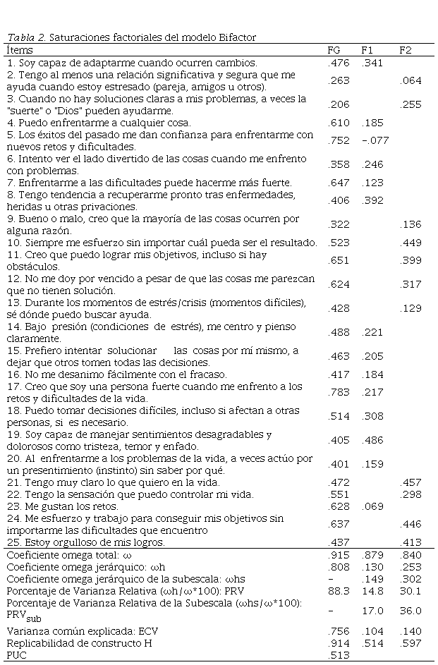 La Tabla 2 presenta las cargas factoriales estandarizadas para AFC del modelo Bifactor y los índices de fiabilidad del FG y de las subescalas. Las cargas factoriales estandarizadas para el FG fueron todas estadísticamente significativas (.<.001) y oscilaron entre .206 en el ítem 3 (“Cuando no hay soluciones claras a mis problemas, a veces la "suerte" o "Dios" pueden ayudarme”) y .783 en el ítem 17 (“Creo que soy una persona fuerte cuando me enfrento a los retos y dificultades de la vida”). Sólo dos cargas factoriales estandarizadas fueron menores que .3, ítem 2 (“Tengo al menos una relación significativa y segura que me ayuda cuando estoy estresado (pareja, amigos u otros”) con un valor de .263 e ítem 3. Por su parte, las saturaciones de los factores específicos variaron entre .064 (ítem 2, factor 2) y .486 (ítems 19, factor 1), mayoritariamente (23 ítems) fueron comparativamente menores que las del FG.