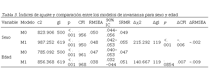 Al evaluar los modelos de invarianza de configuración y de umbrales (escalar) para la variable sexo y edad, se observaron satisfactorios índices de ajuste para ambos modelos (ver Tabla 3). Al comparar estos modelos se observan diferencias estadísticamente significativas (.<.001) considerando la variable sexo, por lo que se recurre a criterios adicionales para evaluar el grado de invarianza mediante las diferencias de CFI y RMSEA. Con estos criterios se mantiene la hipótesis de equivalencia entre ambos modelos, por lo que se acepta el nivel de invarianza de umbrales. Para la variable edad, no se aprecia diferencias estadísticamente significativas (.=.0854), por lo que se mantiene la hipótesis de equivalencia entre ambos modelos, permitiendo la elección del modelo más parsimonioso, en este caso el de invarianza de umbrales.