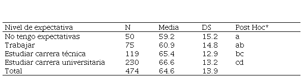 Considerando la variable expectativa de vida de la ficha sociodemográfica y las puntuaciones del factor general de la escala CD-RISC, los resultados del ANOVA fueron estadísticamente significativos (F=6.23, 3 g. de l., .<.001). El estadístico de Levene fue de .4 (.=.75), las pruebas post hoc se muestran en la Tabla 5, donde letras iguales indica que no hay diferencias estadísticamente significativas al .05 respecto al promedio de recursos resilientes medidos por la CD-RISC y las expectativas reportadas por los adolescentes y letras diferentes indican que existe diferencias estadísticamente significativas al .05. Además, es posible reportar un tamaño del efecto de .038, considerado pequeño (Frías-Navarro, 2015), y la potencia observada de .964. Estos resultados muestran que, en general, a mayor expectativa reportada por los adolescentes, en promedio, se esperaría obtener mayores recursos resilientes reportados por la escala CD-RISC. Esta variable aporta evidencia débil de validez discriminante, lo que sugiere una mayor exploración en futuras investigaciones.