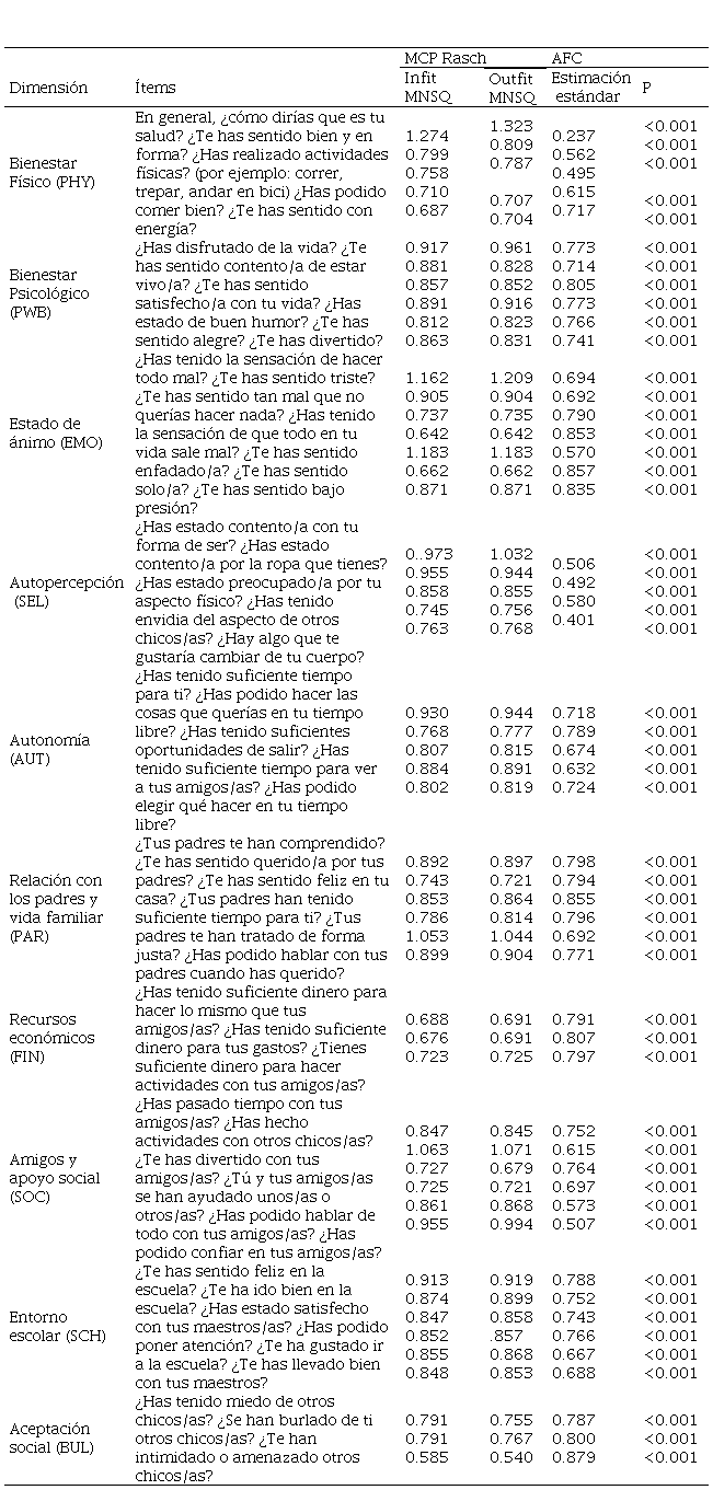 De igual forma, el uso de modelos de Rasch se presenta únicamente en el estudio original del grupo KIDSCREEN y en el realizado en Argentina y Chile (Berra al., 2009; Sepúlveda et al., 2013). En relación al AFC, el estudio original utiliza el método de máxima verosimilitud para la estimación de parámetros, el cual puede presentar un sesgo importante dado el tipo el tipo de respuesta ordinal del instrumento. Por otro lado, tanto el estudio de Hidalgo Rasmussen et al. (2014), como el elaborado en Argentina (Berra et al., 2009) y en Chile (Sepulveda et al., 2013), no reportan el método de estimación de parámetros utilizado. Finalmente, en cuanto a análisis de invarianza, ninguno de los artículos citados lo presenta.