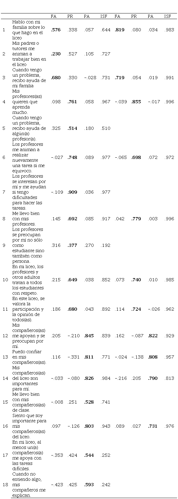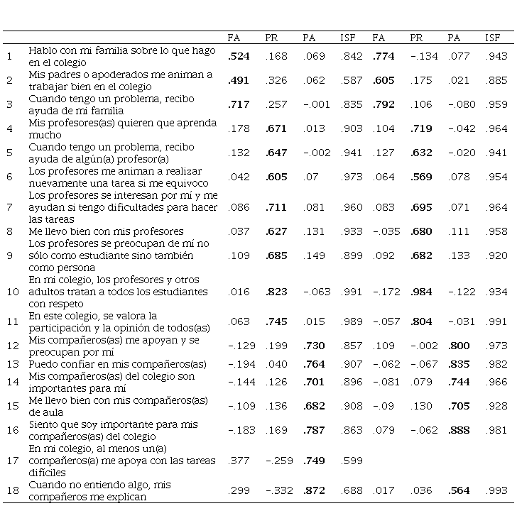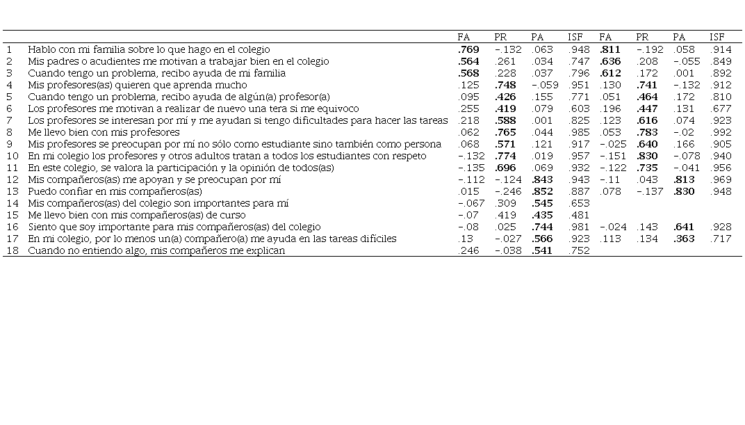 Cuestionario Factores Contextuales (CFC, Universidad de la Frontera y la Universidad Autónoma, 2016), desarrollado para adolescentes chilenos, consta de 18 ítems que se agrupan en tres factores de contexto: familia (3 ítems), profesorado (8 ítems) y pares (7 ítems), con una escala de respuesta tipo Likert de 5 puntos, desde 1 (nunca o casi nunca) a 5 (siempre o casi siempre). Los resultados reportados por los autores originales muestran adecuados niveles de ajuste de los datos al modelo de tres factores correlacionados, así como de consistencia interna.