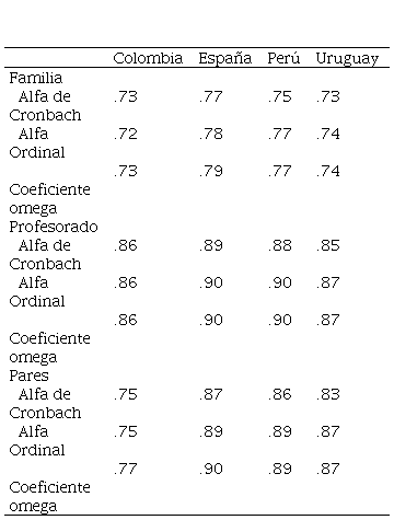Finalmente, la fiabilidad fue adecuada en cada uno de los países medida a través de todos los índices analizados (Alfa de Cronbach, Alfa Ordinal y Coeficiente Omega, ver Tabla 6).