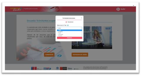 Durante 2019 se recogieron datos en centros educativos participantes de Perú, Colombia, Uruguay y España. Las versiones finales de los cuestionarios fueron alojados para cada país en la plataforma informática de forma diferenciada, permitiendo a cada uno de ellos acceder a la versión del cuestionario de su país (ver Figura 9). De este modo, los cuestionarios fueron los mismos (con directa equivalencia entre ítems), con pequeñas variaciones en la redacción y el vocabulario adaptado a cada país, pero manteniendo la equivalencia en el contenido.