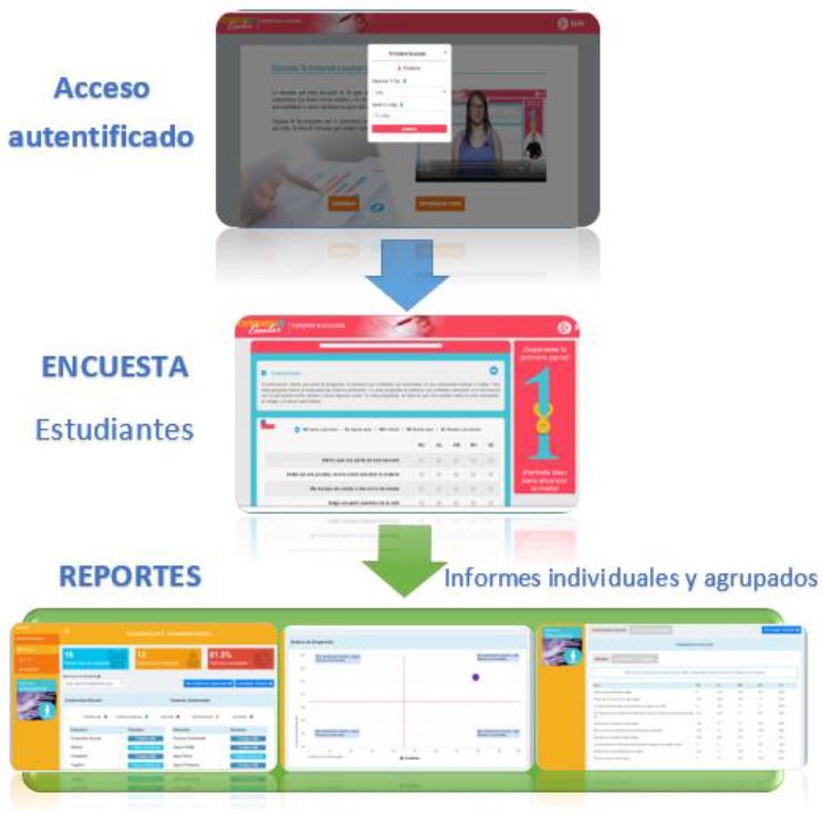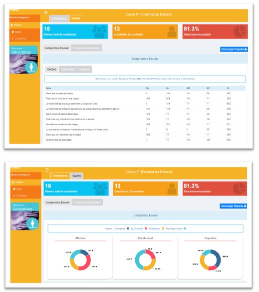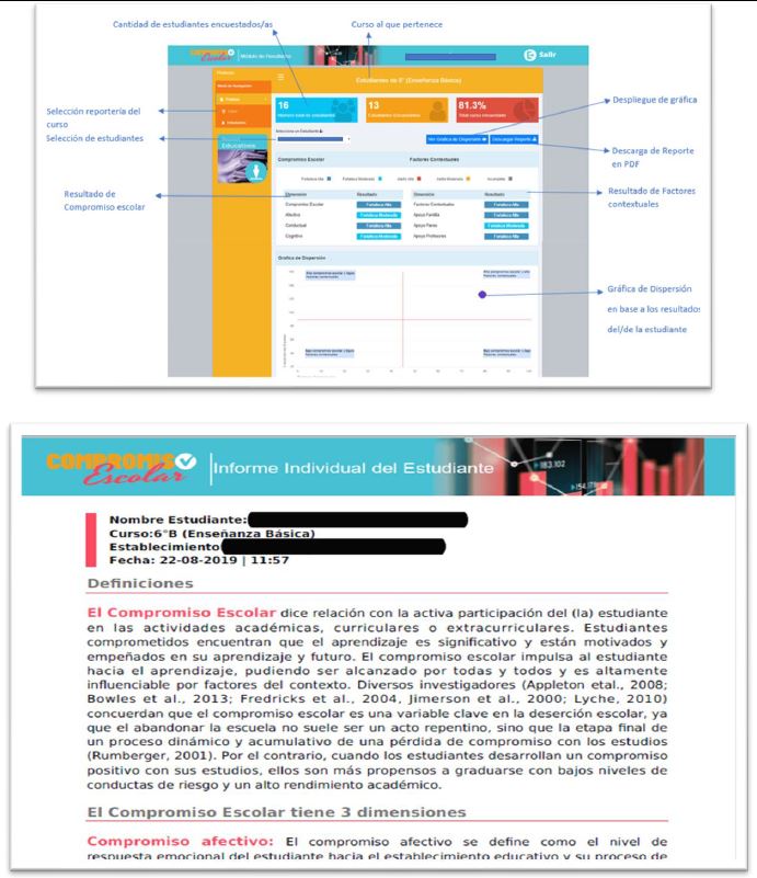 La plataforma de evaluación online de compromiso escolar desarrollada y validada en Chile (y que ha servido de referente para otros países de Iberoamérica), operacionaliza el CE a partir de tres dimensiones principales: afectiva, conductual y cognitiva (Saracostti et al., 2019). La primera versión se inició desde una base web que posibilitaba la aplicación de cuestionarios online a estudiantes de séptimo básico a primero medio en Chile (en los que los y las estudiantes tienen entre 12 y 14 años, a excepción de los casos en los que repiten curso) y la extracción de reportes en línea (Saracostti et al., 2019). Con el fin de facilitar el análisis de los resultados, se diseñó una versión 2.0, logrando ampliar la cobertura de seguimiento desde los estudiantes de 7º básico a 3° medio. En ella, el/la profesor/a, los equipos psicosociales o psicopedagógicos, y directivos de cada Institución, a través de usuarios/as personalizados, pueden acceder a los resultados que arroja el sistema a nivel de estudiante, curso y colegio, y a las sugerencias para promover trayectorias educativas exitosas para cada estudiante. El objetivo de este cambio se debe a que no sólo es relevante detectar de manera temprana estudiantes que presentan un bajo CE, sino que también es deseable prevenir que dicha falta de compromiso se vaya agudizando en el tiempo, por lo cual se hace necesario buscar formas de promover dicho compromiso en toda la comunidad estudiantil.