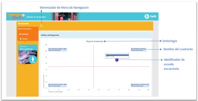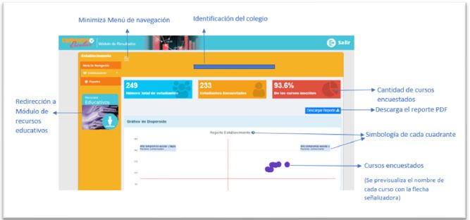Para facilitar el análisis e interpretación de los resultados que genera la aplicación para la medición del CE y los factores contextuales, se desarrolló un módulo de reportes que presenta en forma gráfica la medición: de forma individual, por curso, establecimiento y sostenedor.