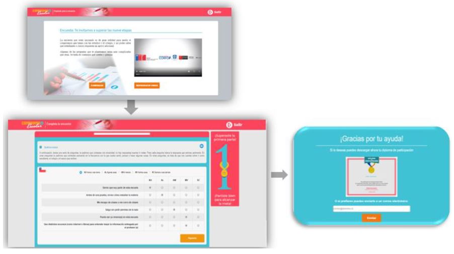 Como se muestra en la Figura 3, para facilitar la interacción con la encuesta, cada una de las pantallas incluye instrucciones, que se pueden desplegar o comprimir, una barra de avance que le indica al usuario en forma gráfica el porcentaje de llenado y botones para navegar a través de las pantallas de la encuesta. Además, incluye información visual frente a cada una de las opciones de respuesta para ayudar a la selección por parte de los estudiantes. Sin embargo, como una forma de asegurar que la encuesta sea respondida íntegramente por parte de los estudiantes se incorpora una funcionalidad que impide avanzar a la siguiente pantalla sin haber respondido todos los ítems. Al finalizar y enviar la encuesta, los estudiantes tienen acceso a un diploma de participación que puede ser descargado en PDF para su impresión o puede ser enviado a una dirección de correo electrónico.